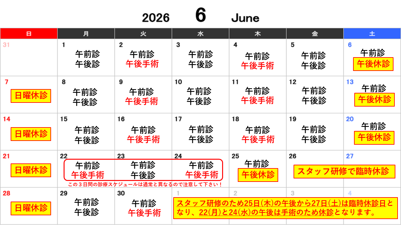 - ■日・祝休み、土曜日は午前のみ診療、翌月曜が祝日の場合は、前の週の土曜も休診となります。 その他病院が定めた臨時休診日もあります(下記の診療カレンダーを参照下さい)。